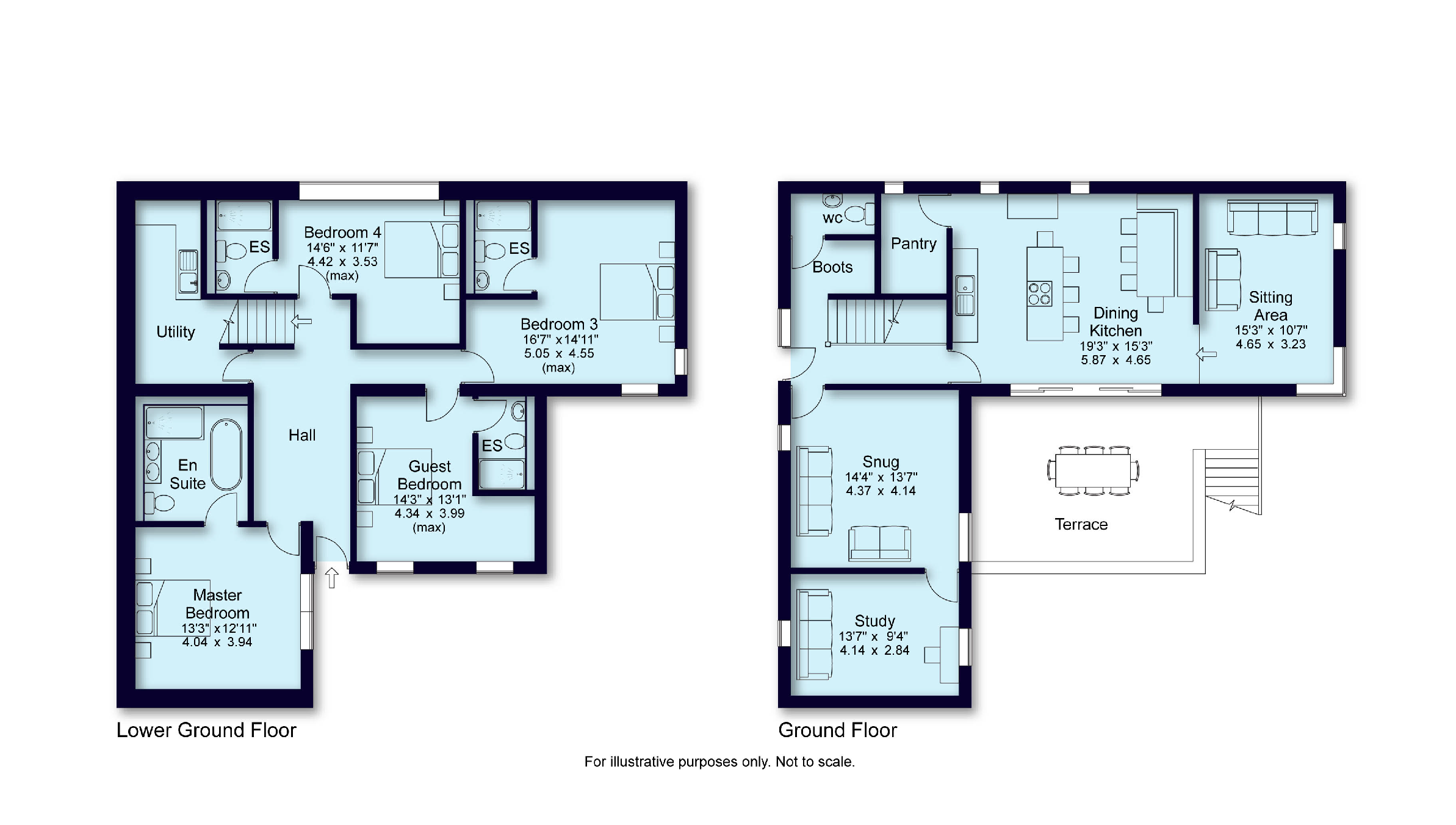• Fitted carpets throughout bedrooms, snug/study and lower ground floor hallway